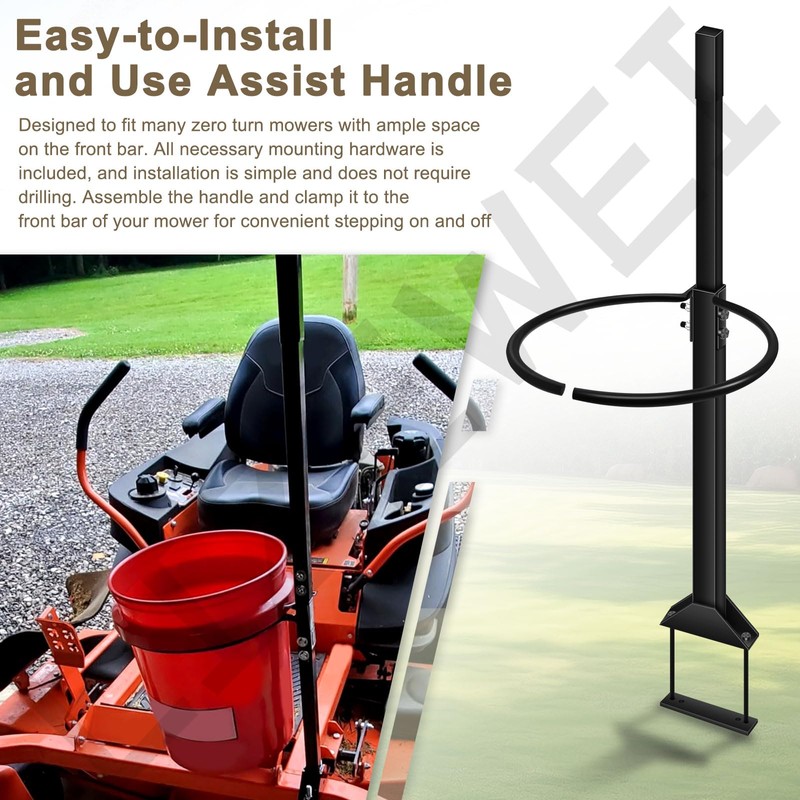 - Easy-to-Install and Use Assist Handle: Designed to fit many zero turn mowers with ample space on the front bar. All necessary mounting hardware is included, and installation is simple and does not require drilling. Assemble the handle and clamp it to the front bar of your mower for convenient stepping on and off.