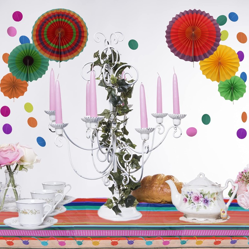 • PACKAGE INCLUDES 1 x Multicolor Tablecloth, 1 x Fiesta Banner, 25cm Paper Pom Poms, 6 x Hanging Paper Fans, 15 x Paper Tassels, 1 x Circle Dot Garland. (Colour: multi-coloured)