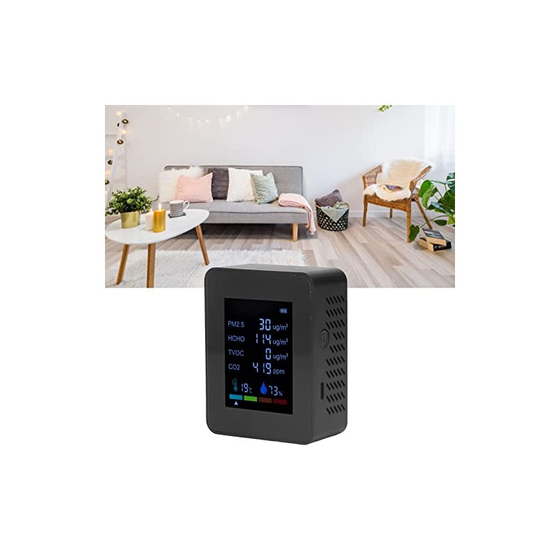 - Multifunctional detector: 6 in 1 air quality monitor can detect and display CO2, TVOC, HCHO, PM2.5, temperature, humidity, to help users understand the environment. Intelligent colour screen display: CO2 monitor has intelligent colour screen display, the numbers are clear, easy to identify and read. Gift ideas for the office