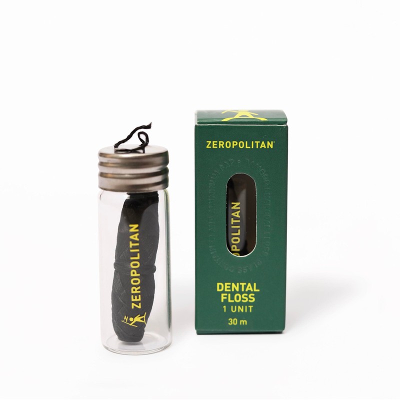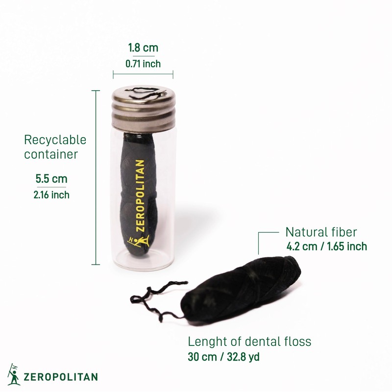 Zeropolitan - Bamboo Charcoal Dental Floss - 33yd/30m of Natural and Biodegradable Floss in Reusable or Recyclable Glass Container - Mint Flavored/Compostable