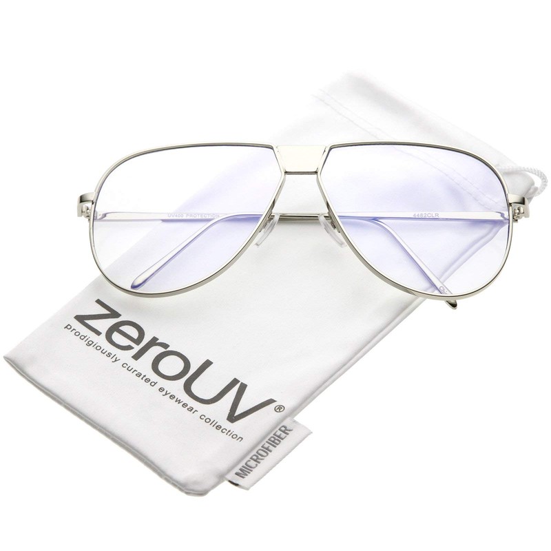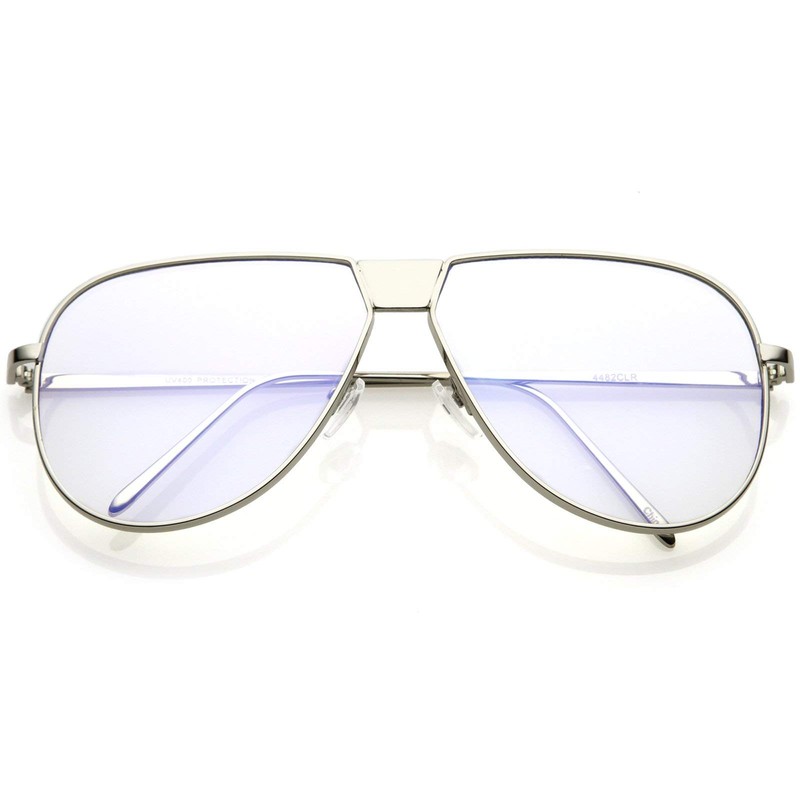 zeroUV - Oversize Full Metal Flat Top Clear Flat Lens Aviator Glasses 60mm (Silver/Clear)
