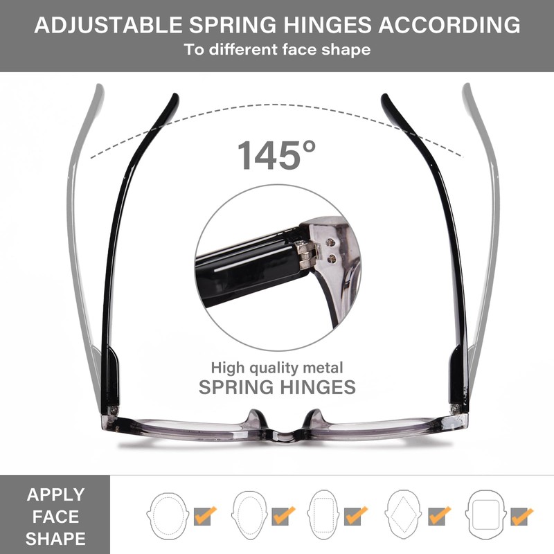 - FLEXIBLE SPRING HINGE : Adjustable spring legs find the fastest and best fit for different face shapes without uncomfortable squeezing and pressure.Suitable for all face types, whether your face is oversized, petite or medium, it will easily solve your problems.