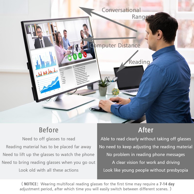 - NOTE : Before selecting the correct magnification, it is recommended to consult an optometrist for accurate magnification recommendations. Otherwise, the multiple is too strong or too weak, will cause blurred vision or dizziness. Please choose carefully. After the age of 40, vision changes from year to year and requires the attention of the buyer. For first-time multifocal reading glasses wearers, it can take one to three weeks to get used to.