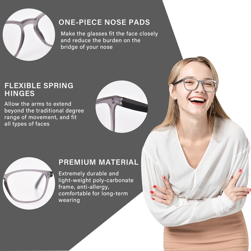 • STYLISH & CLASSIC READING GLASSES- The durable oversized poly-carbonate frames and flexible spring hinges make it perfectly fit for most kinds of face shapes, with no slip on nose or pinch on ear. Also, our progressive multifocus reading glasses are designed in fashionable square shade frames and classic color, stylish and trendy for blue light progressive readers, and you can even wear them at social, office settings, and formal occasions