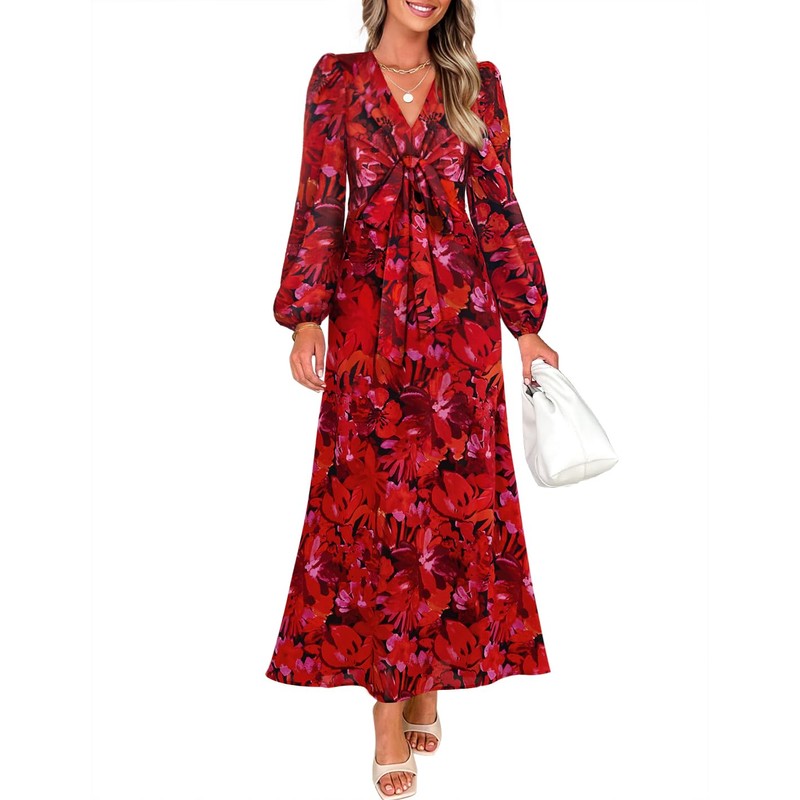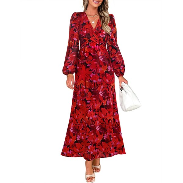 ZESICA Fall Floral Dresses for Women 2025 Elegant Long Sleeve V Neck Mesh Cocktail Wedding Party Maxi Dress Red L