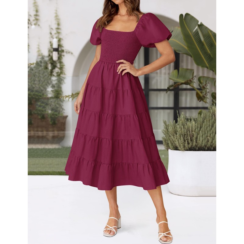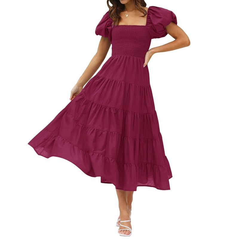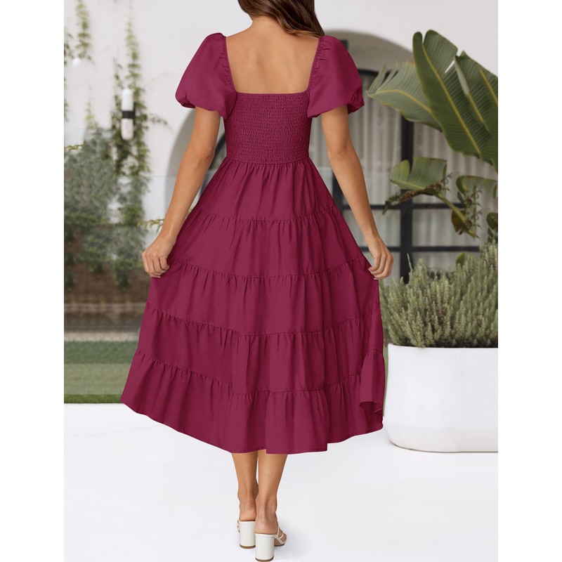 ZESICA Women's 2025 Summer Square Neck Short Puff Sleeve Solid Color High Waist Casual Smocked Flowy A Line Tiered Midi Dress,Fuchsia,Medium