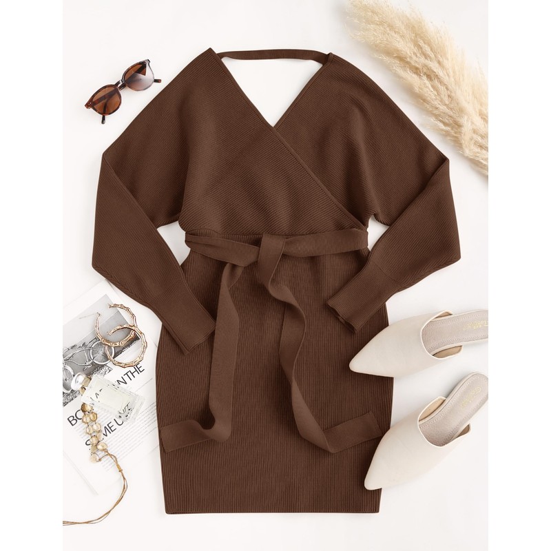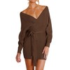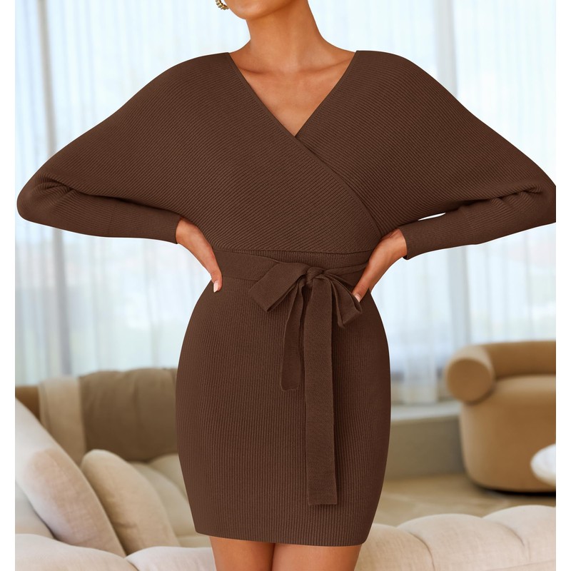 ZESICA Women's Fall Long Batwing Sleeve Wrap V Neck Knitted Backless Bodycon Pullover Sweater Dress with Belt,Brown,Medium