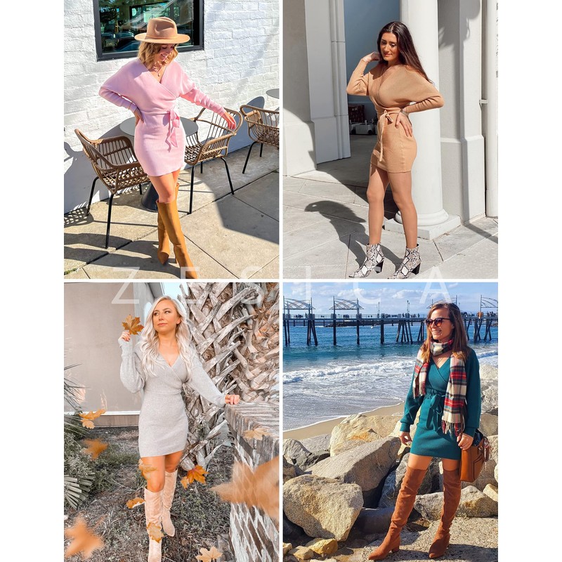 - Sexy wrap v neck, long batwing sleeve, adjustable waist belt, unique v design in front and back, solid color, slim fit, stylish knitted one-piece dress.