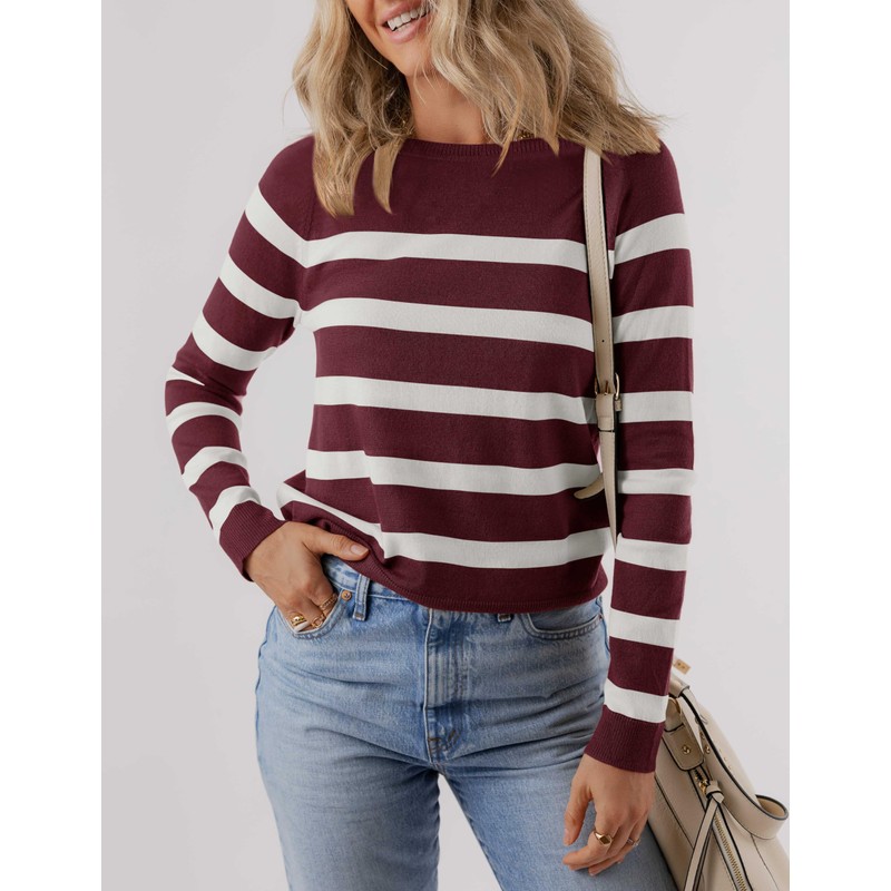 - This basic striped sweater is an indispensable item in your fall and winter closet! The trendy sweater tops feature a striped design, loose fit style, long sleeve, crew neckline, ribbed knit texture, short length, trendy and casual