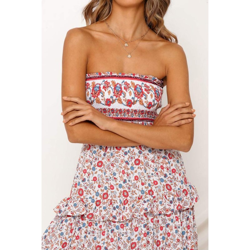 - The perfect summertime essential! Boho Maxi Long Dress: Strapless shirred bodice style,Vintage floral print ,Subtle ruffle trimming throughout,Flowy tiered ruffle skirt,Shirred and stretchy waist,Above Ankle length