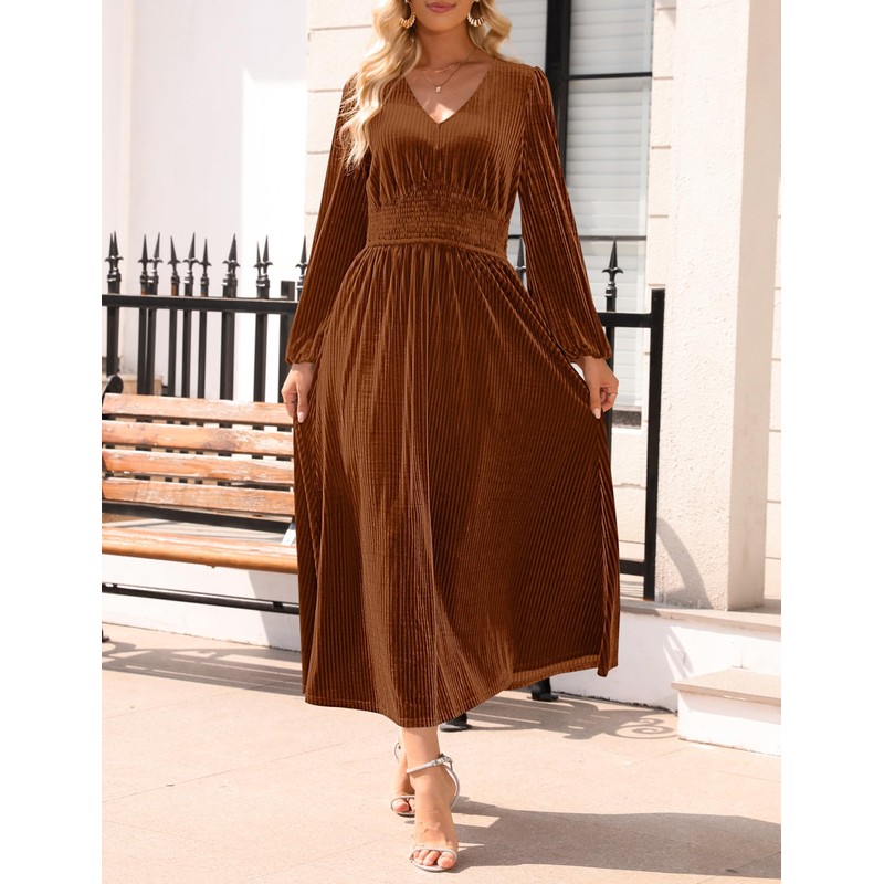 ZESICA Women's Velvet Midi Dress Casual V Neck Long Sleeve Solid Color Elastic High Waist Flowy Evening Party Dresses,Caramel,Large