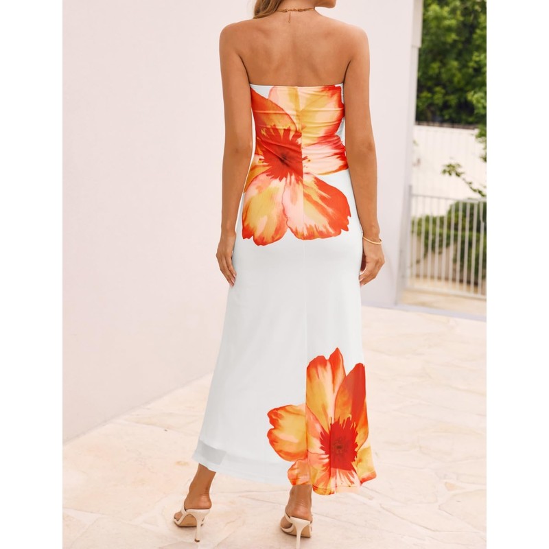 - This bohemian Maxi dress features a vibrant floral pattern that adds a touch of nature's elegance to your summer closet; the sleeveless strapless design and flattering cut accentuates your curves and creates a flirty, confident vibe