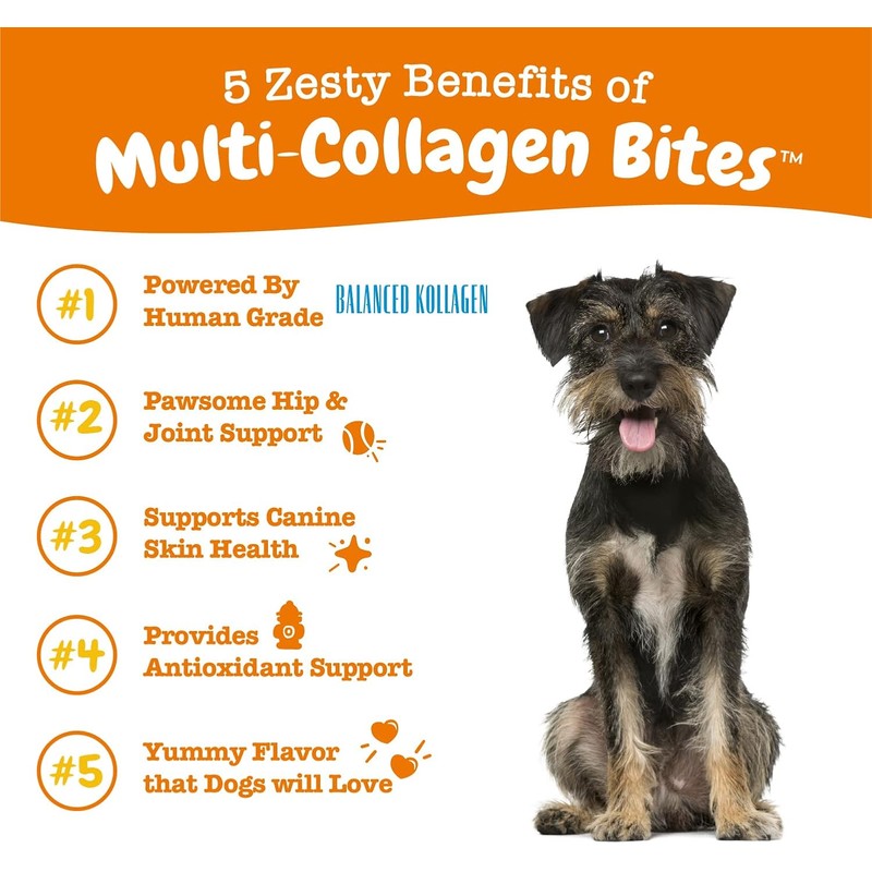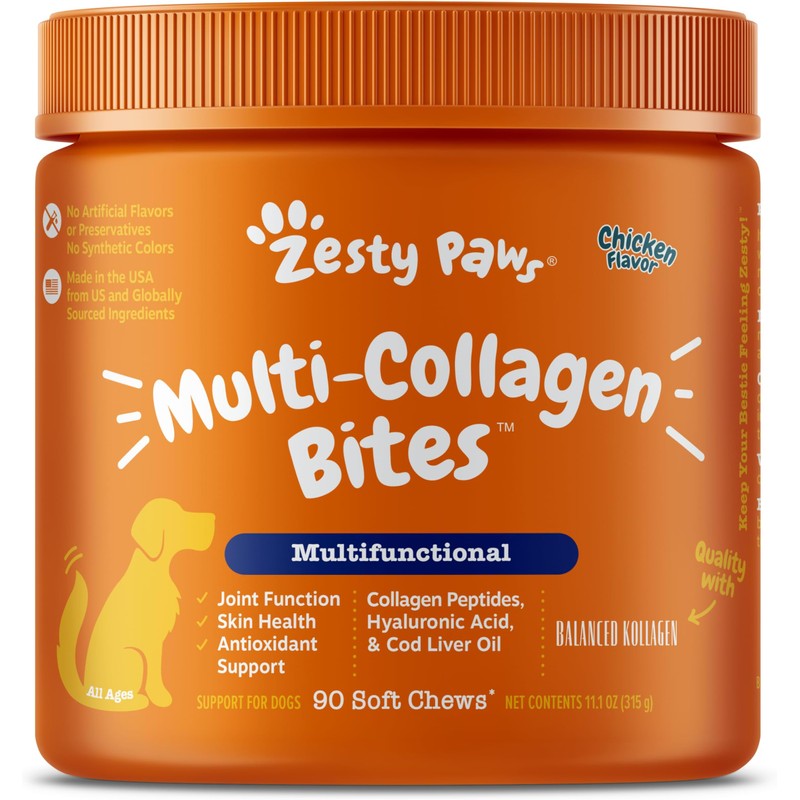 - Premium Multi-Collagen for Fido - Multi-Collagen Bites are supplements with collagen peptides and other ingredients that provide hip, joint, cartilage, skin, and antioxidant support.