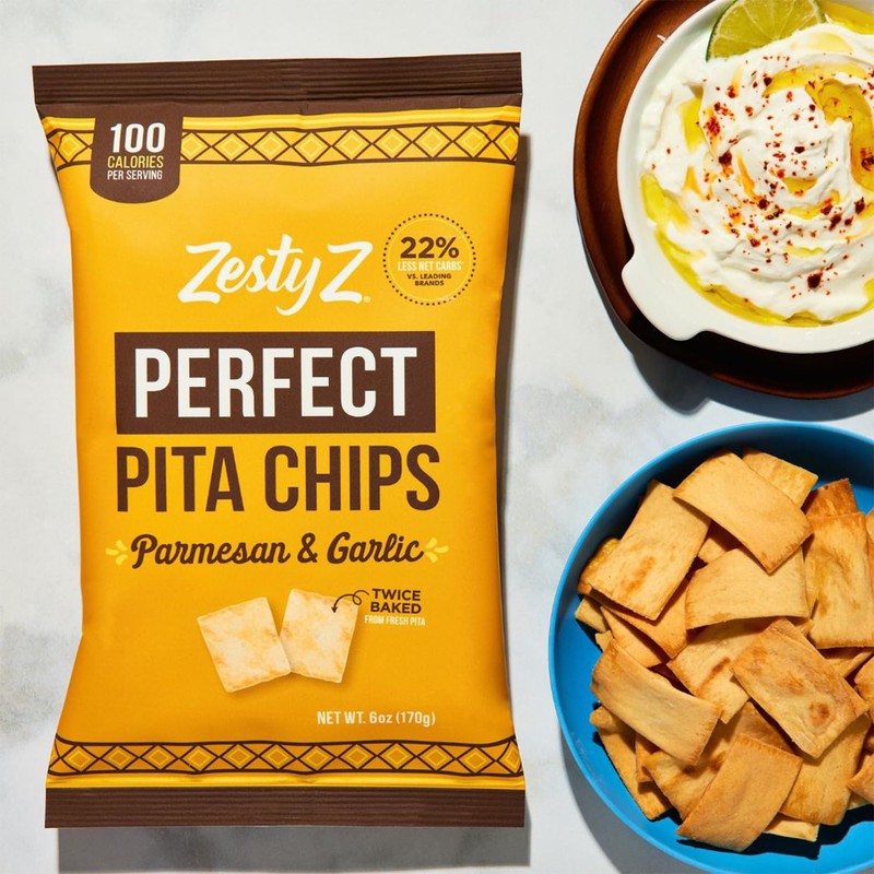 - Twice Baked: From fresh made pita bread which makes these chips super crunchy and light. Try both our flavors: Sea Salt or Parmesan Garlic - Or get Zesty and grab both!