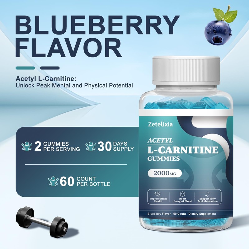 Zetelixia Acetyl L-Carnitine Gummies 2000mg, L Carnitine Supplement with Vitamin B12 & C, ALCAR for Energy, Brain & Mood Support, Fatty Acid Metabolism, Vegan, Gluten-Free, Blueberry, 60 Count
