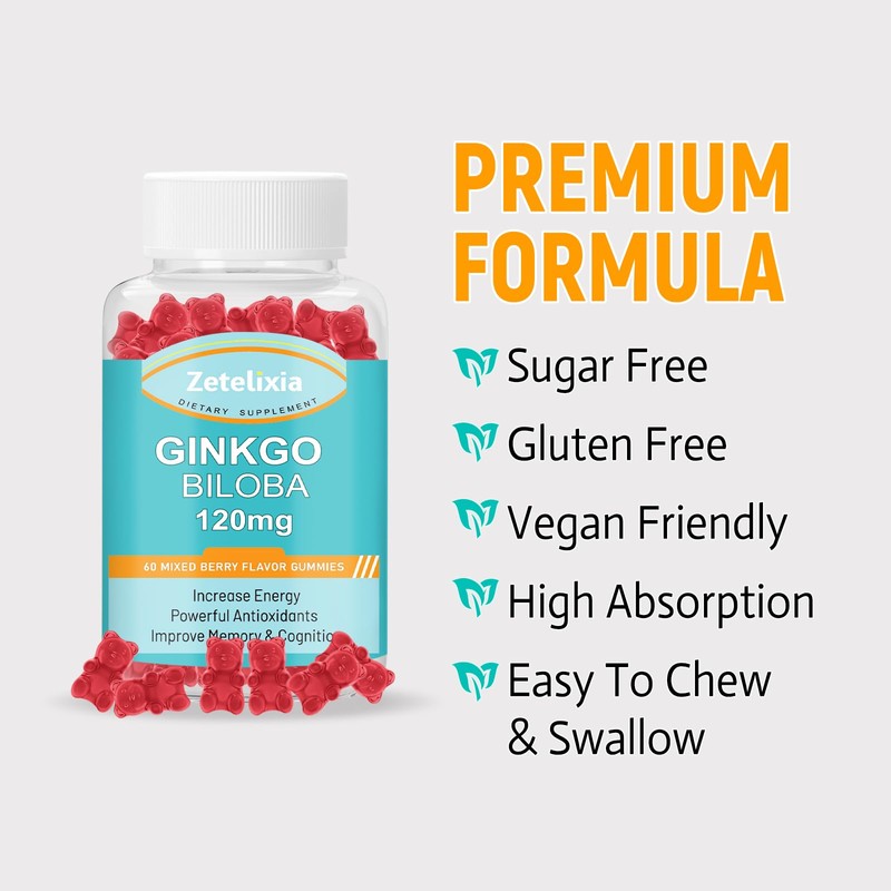 Zetelixia Ginkgo Biloba Gummies 120mg for Women & Men, Brain Supplement Improve Better Mood & Focus, Vegan, Non-GMO, Sugar Free Raspberry Flavor, 60 Count