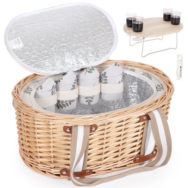 - Charming & Complete Set: Includes a beautiful oil-rubbed wicker basket, white floral-lined cooler bag, 4 napkins, 1 bottle opener, 4 plastic wine glasses, and a convenient wine table for easy setup. Everything you need for a memorable picnic experience