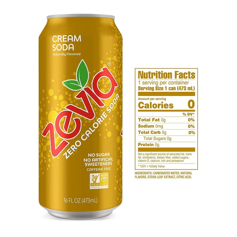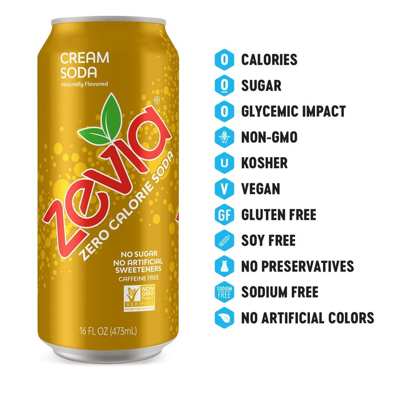 - ZERO GUILT: Zevia Zero-Calorie Cream Soda is refreshing, full of flavor, and tasty. It's the naturally sweetened bubbly choice you and your family crave that has zero calories, zero sugar and zero artificial sweeteners so you're full of good choices.
