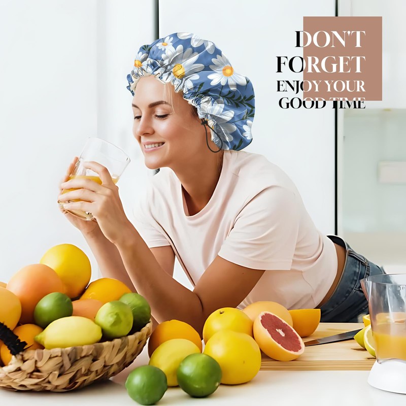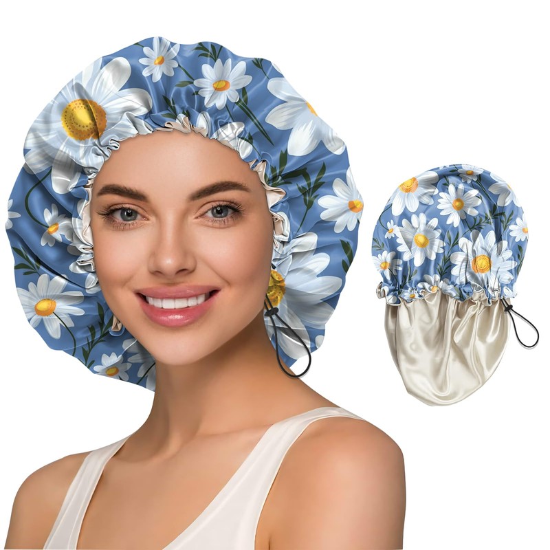 Zewurtuw Luxury Shower Cap Adjustable Reusable Double Waterproof Layer Elastic Satin Lined Hair Bath Cap Cute Aesthetic Women Girls-Chrysanthemum