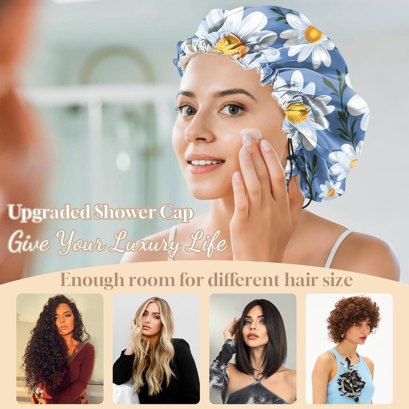 - 【Double-Layer Design】The shower cap is made of outer-layer waterproof fabric and the inner lining is a soft and smooth satin.It's a shower cap that really doesn't wet your hair.which gently glides over the hair to protect your hair from the dryness caused by friction,reduce hair frizz,tangles and thinning.