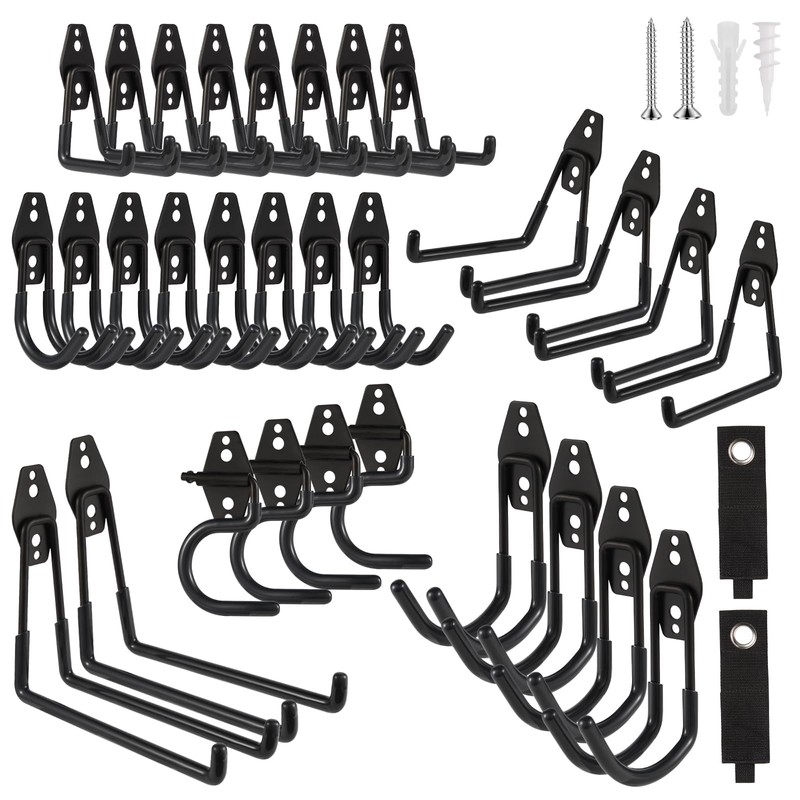 - ZexHok Wall Hook Assortment Set: 32 pack storage hooks organizer include with 6 sizes: 8pcs small J hooks, 8pcs small U hooks, 4pcs large J hooks, 4pcs middle U hooks, 2pcs large U hooks, 4pcs S hooks and 2pcs straps for hanging tools of different sizes and weight.