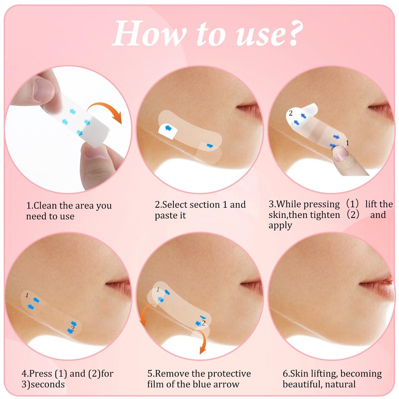 - Easy to use: simply "stick", "peel" and "peel" in 3 steps creates a firm facial contour. Place one end of the facelift tape on your face, gently pull it back 2.5 to 5 cm and press it firmly to achieve a natural look.