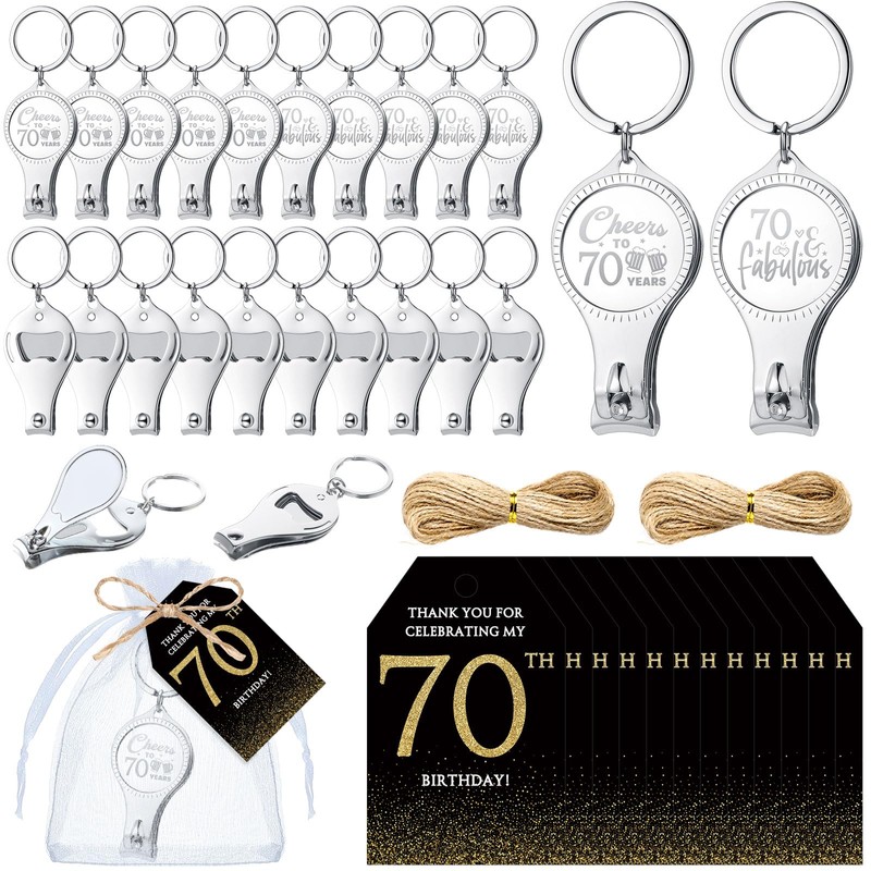 - Comprehensive Package for 70th Celebrations: our 70th birthday party gift pack boasts an abundant selection, including 50 multifunctional bottle opener keychains, 50 organza bags, 50 thank you cards, and 2 bundles of string, ensuring every guest receives a memorable keepsake