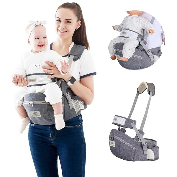 - 【Portabebé cintura ergonómic】 Las tres partes del hombro, la cintura y el abdomen forman un triángulo estable para dispersar la gravedad del bebé y liberar tus manos.