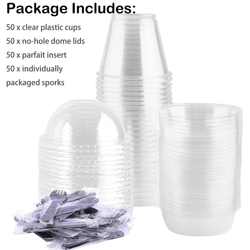 - GREAT VALUE PACK: The package includes 50pcs 9 oz (275ml) clear plastic parfait cups, 50pcs dome lids (No Hole), 50pcs inserts and 50pcs plastic sporks for your convenience.