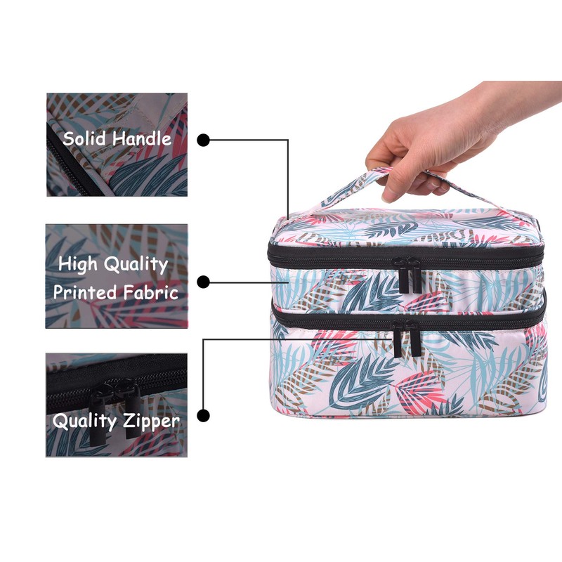 - Double Layer Design: The upper layer has elastic pockets and zipper pockets, which can store nail art brushes, files, stickers, clippers, polish remover and other small accessories and prevent items from scattering. The bottom layer has a foam which can hold 30 bottles of 15 ml (0.5 fl.oz) nail polish