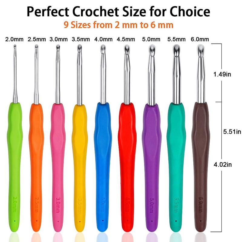 - 9 DIFFERENT SIZES CROCHET HOOKS:Package includes 9 pieces crochet hooks in 9 different sizes:2.0mm,2.5mm,3.0mm,3.5mm,4.0mm,4.5mm,5.0mm,5.5mm,6.0mm.The different colors and scales on the handle are for easy distinguish of different sizes.And the 14cm total length makes them easy to carry.