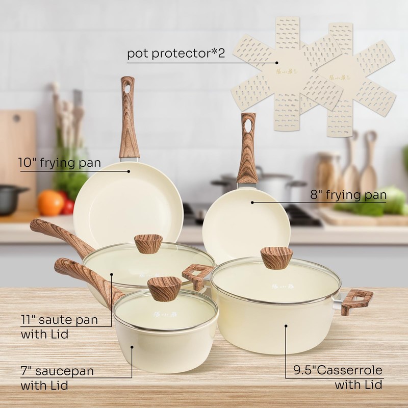 - 10PCS NONSTICK POTS AND PANS SET: Includes 2 frying pans (8"& 10"), one 11"saute pan with lid (4.3QT), one 7"saucepan with lid (2QT), one 9.5"casserrole with Lid (4.5QT) and 2 pot and pan protectos. PTFE/PFAS/PFOA and other harmful chemicals free ensures you eat healthily and safely