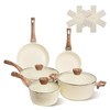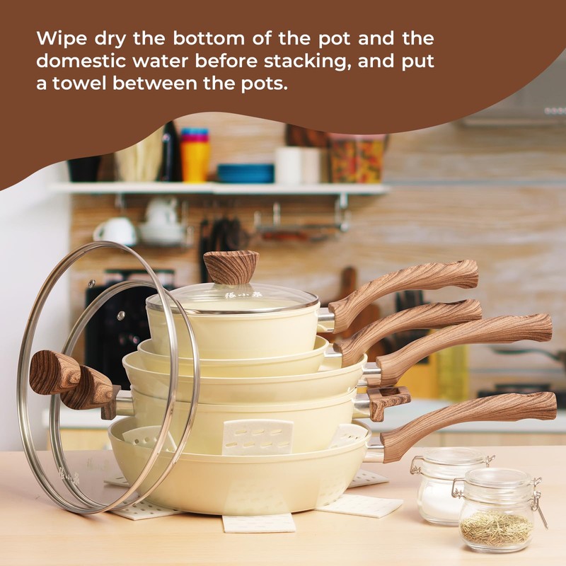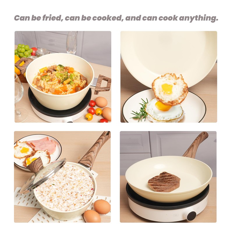 - PRODUCT MATERIAL: Reinforced aluminum pan & pot covered with ceramic coating, which has smooth surface and good non-stick property. Bakelite handles with wooden painted soft touch are ergonomically designed, which offer an easy comfortable grip. And the handle will not be hot during cooking. Tempered glass lids are for easy monitoring of cooking process