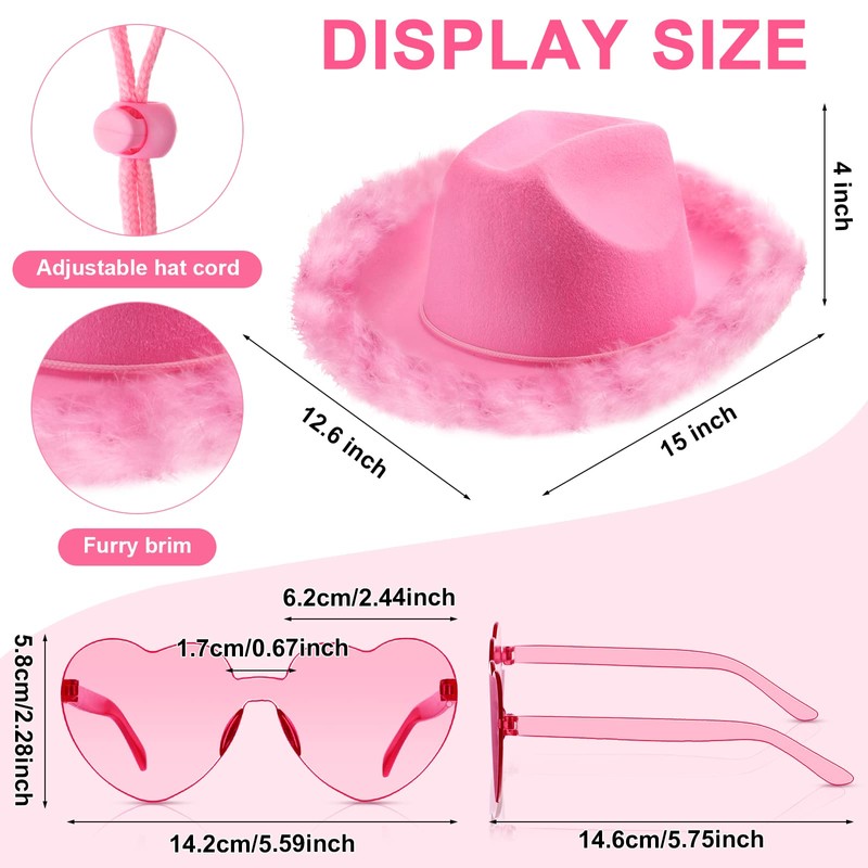 - You Will Get: you will receive 6 pieces of pink cowgirl hats with feathers and 6 pairs of heart rimless glasses; A sufficient quantity can be shared with mates at the party, which are very suitable for daily matching and parties with costumes