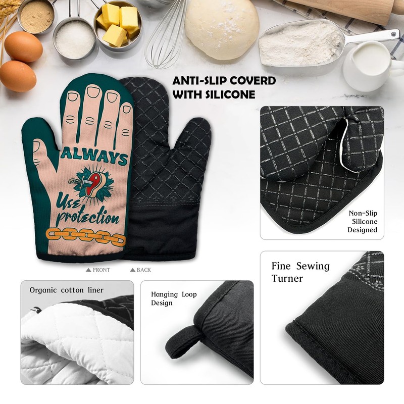 ZHANTUONE Always Use Protection Funny Heat Resistant Oven Mitts 2-Piece Set with Silicone Non-Slip, Humor Home Kitchen Cooking Baking Gadgets, Gifts for Bake Lover Bakers Husband Wife Sister BFF