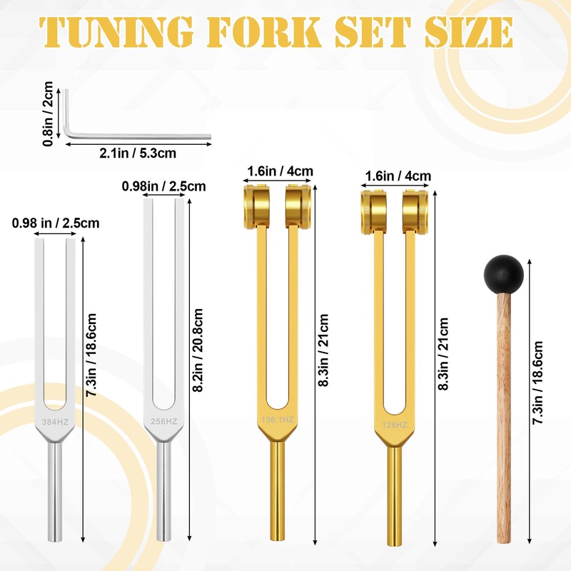 - ใ๐๐ซ๐๐๐ข๐ฌ๐ ๐ ๐ซ๐๐ช๐ฎ๐๐ง๐๐ฒใTuning fork set include four frequency forks: 128Hz, 136.1Hz, 256Hz and 384Hz, all precisely calibrated to ensure pure sound quality, meeting various healing needs. Also include a reflector hammer for added convenience, helping you easily enter a state of meditation and relaxation.
