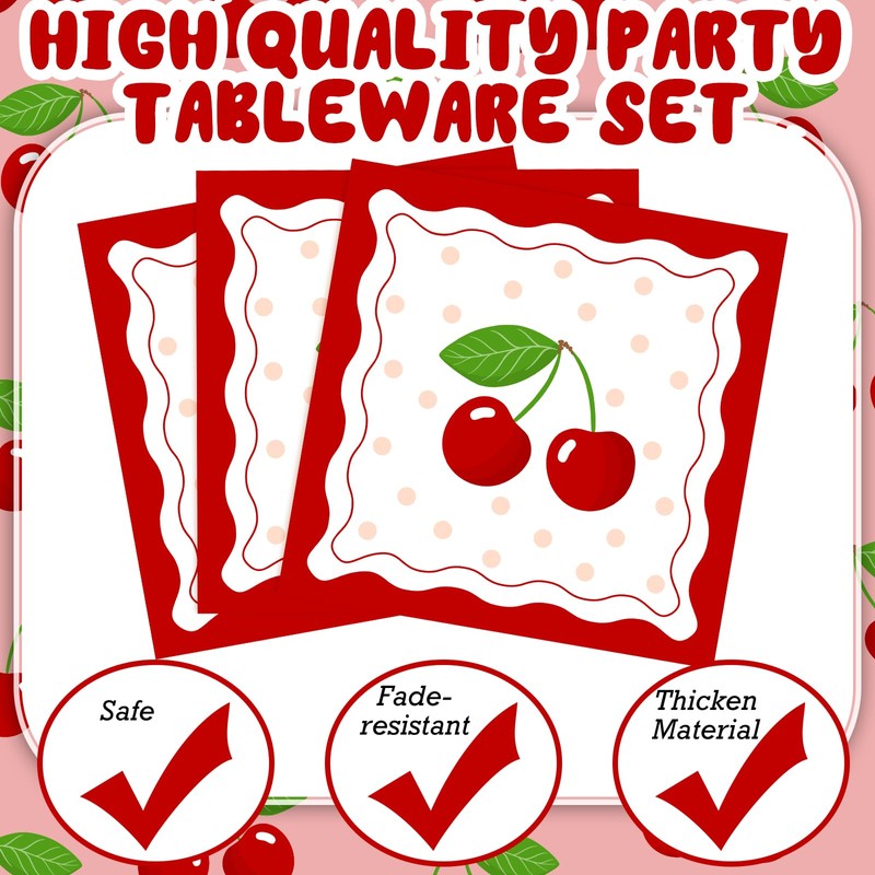 - Quality Materials: our cherry dinnerware and napkins are crafted from quality paper that resists tearing, while the utensils are crafted from durable, safe plastic; This cherry birthday tableware can handle a variety of party foods, ensuring your celebrations are easy and smooth