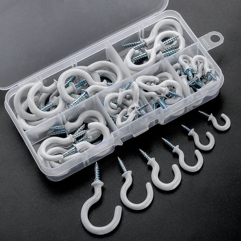 - Comfortable and safe: all cup hooks are stored in a plastic box for easy storage and sorting. Warm Tips Since the end of the hook screw is sharp, please keep it away from children and babies.