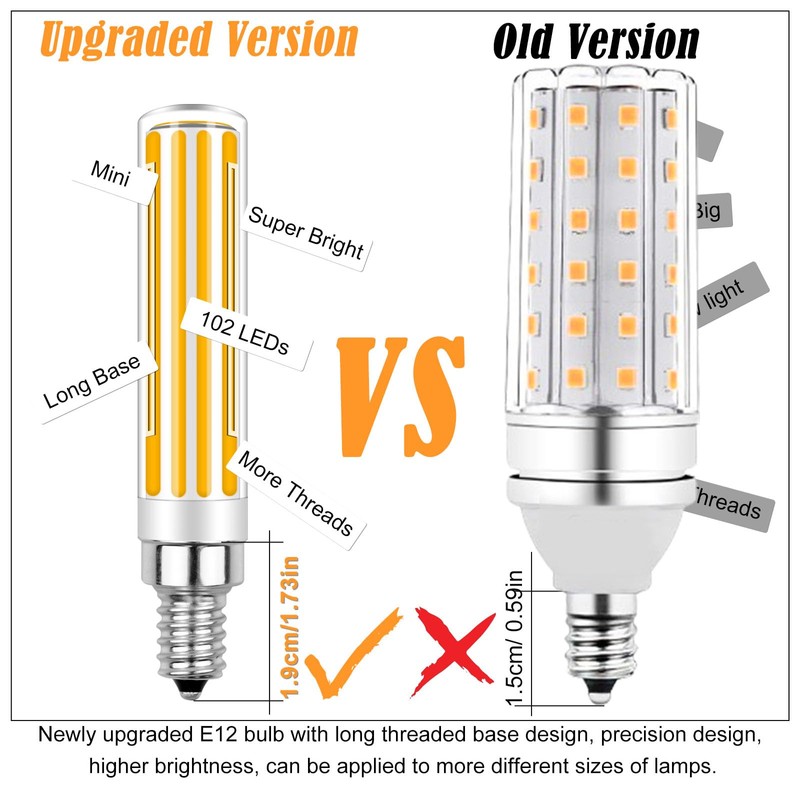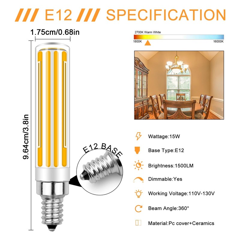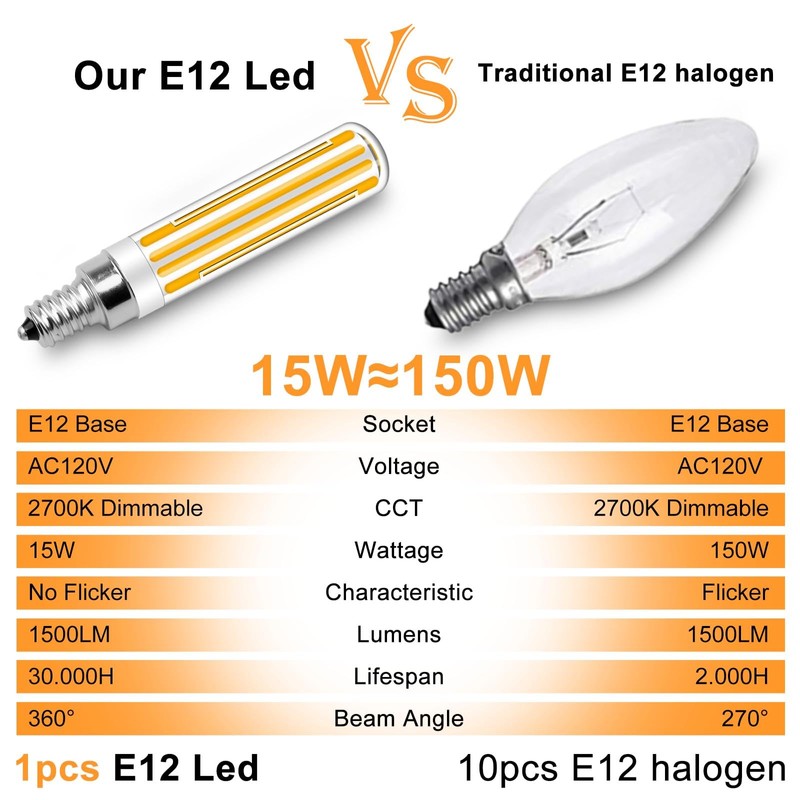 • 💡【Energy Saving & Eco Friendly】E12 15W LED led bulb emit 1500Lumens of light output, bright enough to replace 120 watt-150 watt E12 halogen bulb, saving up to 90% on your energy bill. No lead or mercury.E12 candelabra small base screw socket means the base diameter is 12mm, not e11, e17, e26!!