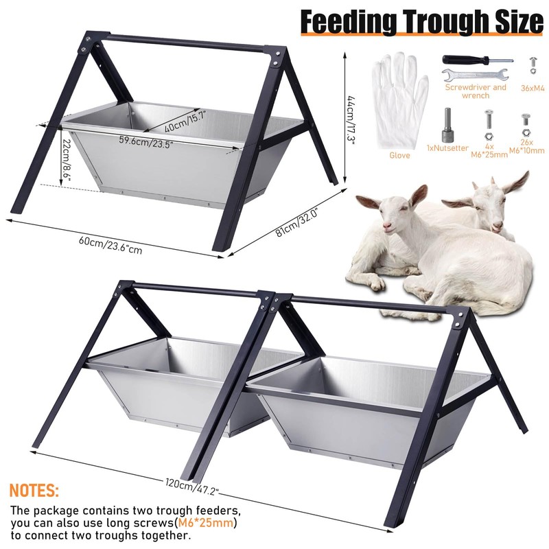 - Feeding Trough Size: Each trough measures 23.5" L x 15.7" W x 8.6" H; the package contains two stainless steel trough feeders, you can also use long screws to connect two feeding troughs together