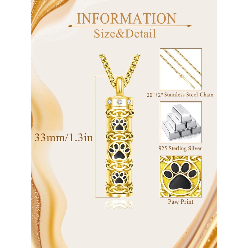 - 【 Design Concept 】: This urn necklace for features a cylinder vial and pet paw print design, which is a great way to commemorate our lost pet. Urn pendant can hold pet ashes, cat ashes, dog ashes. No matter where you go, bring your beloved pet close to your heart and always be with you.