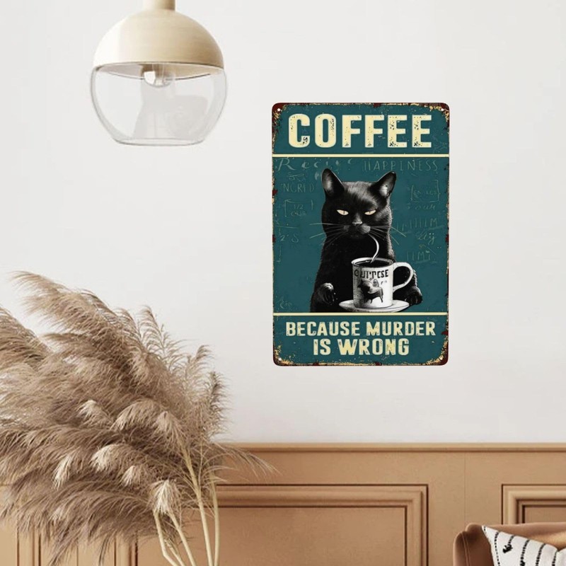 ZHIQUN Cat Coffee Metal Plaque 8X12IN - "Coffee Because Murder Is Wrong" Retro Bar Decor for Kitchens & Cat Theme Cafe Wall Art