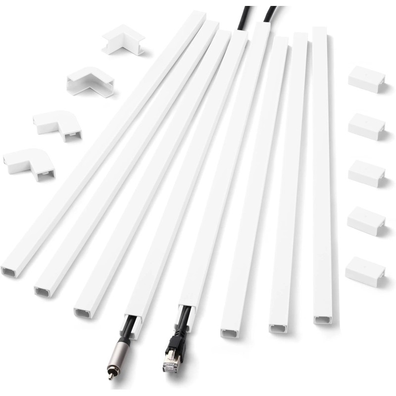 - 136-inch Cable Concealer (Not a single long piece): This cable management kit includes 8 channels, each cable channel measuring 17’’ long x 0.59’’ wide x 0.40’’ high; Smooth edges allow seamless connections. Accessories comprise 5 couplings, 2 flat elbows, 1 inside elbow, 1 outside elbow. Pre-Applied Premium PE Tape