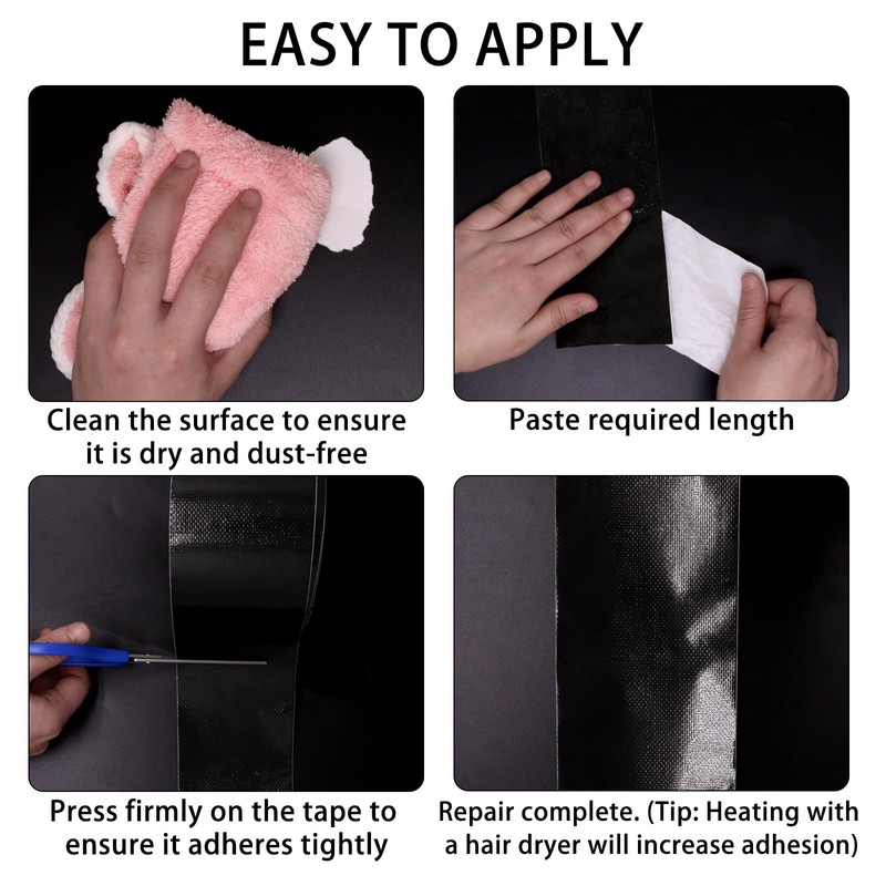 - Strong Adhesive Tape: heavy duty repair tape come with superior adhesion, suitable for repairing fabric, nylon, leather, metal, wood, plastic, glass, vinyl, etc. The longer it is applied, the stronger it becomes, and the hotter the weather, the stronger it becomes. Adapt to any weather conditions including rain, snow, wind, sunny, desert etc. It is recommended to use a blow dryer in cold weather