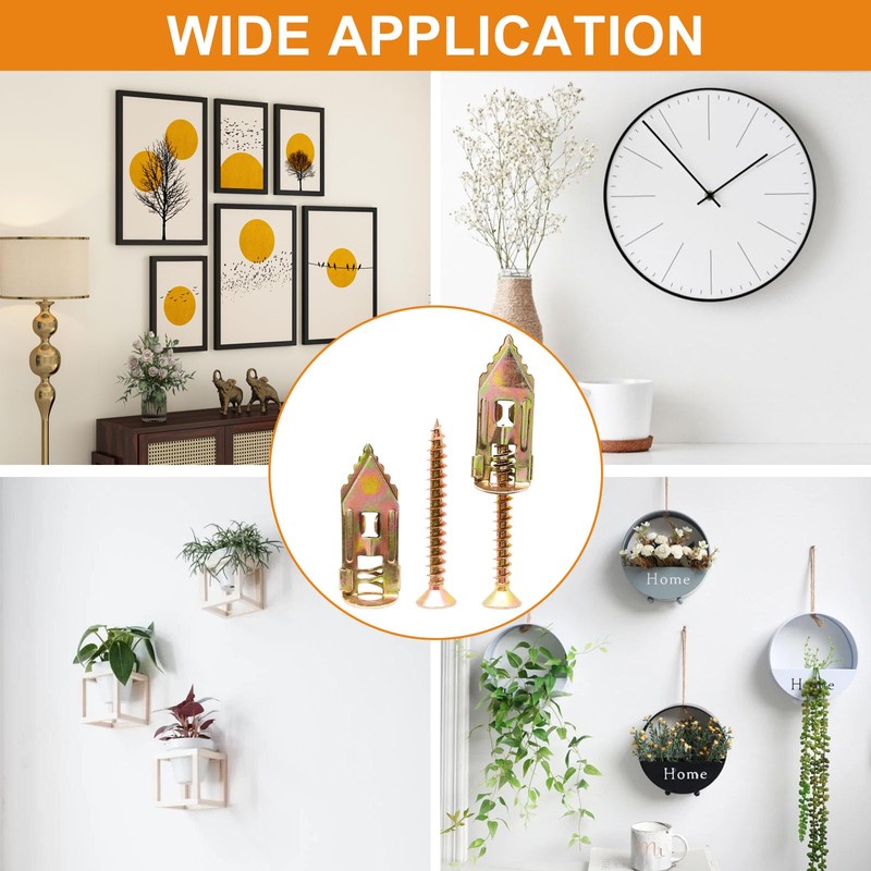 5. No Drilling: No need to pre-drill or punch holes, just insert the anchor and tighten the screws to complete the installation. 6. Widely Applicable: Suitable for hanging a variety of items in home decor, such as picture frames, wall sconces, curtains, clocks, plants, TVs, cabinets, etc. Also suitable for gypsum board, lightweight bricks, hollow bricks, drywall and other materials.