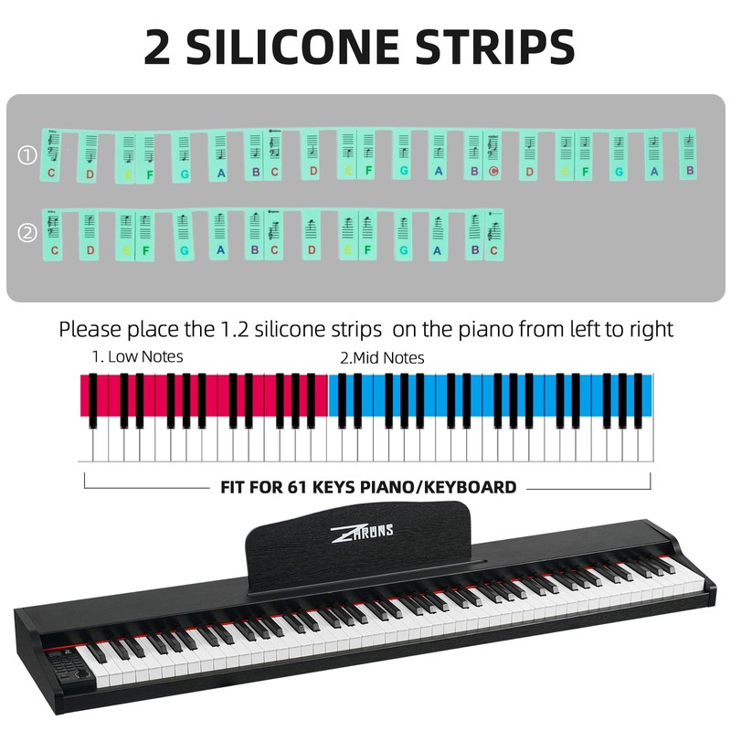 ZHRUNS Removable Piano Key Stickers, 61 Key Full Size Silicone Note Labels, R...