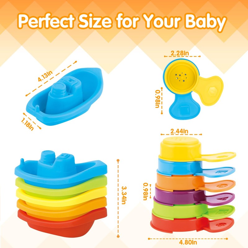 - Safe and portable: made of high quality plastic, no smell and no sharp edges. The boats and spoons are lightweight and safe enough for children to stack and knock. The bathroom toy boat is easy to grip and clean. The stacked volume is small and lightweight, easy to carry and play, so that the baby can use their imagination anytime and anywhere