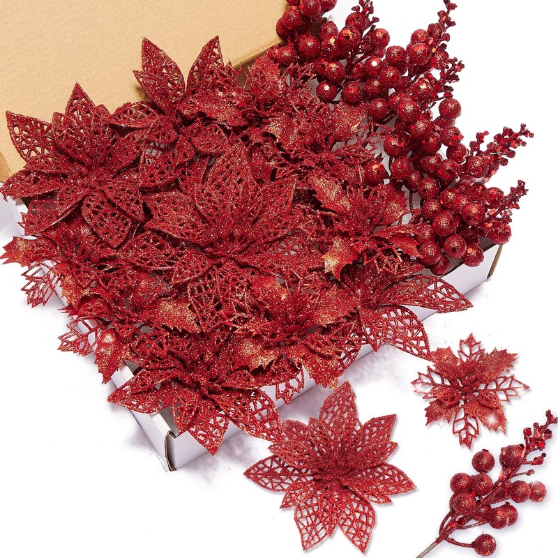 - Package Includes: Our Christmas tree ornaments are packed in boxes. Which can avoid crushing and keep it well. One box includes 16 Christmas poinsettia flowers ornaments and 6 glitter Christmas berry stems. Bright color and special design make it really stand out on the Christmas tree or wreath, garland, mantel, etc. Which is enough for you to decorate your home at Christmas.
