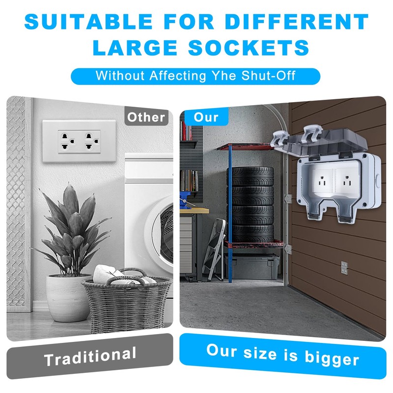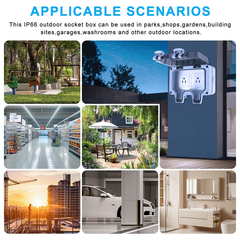 - 【Versatile Application Scenarios】this Ip66 Outdoor Outlet Box Is Suitable for Various Outdoor Locations Such as Parks, Stores, Gardens, Construction Sites, Garages, And Restrooms, Providing a Versatile and Convenient Power Solution for a Wide Range of Environments