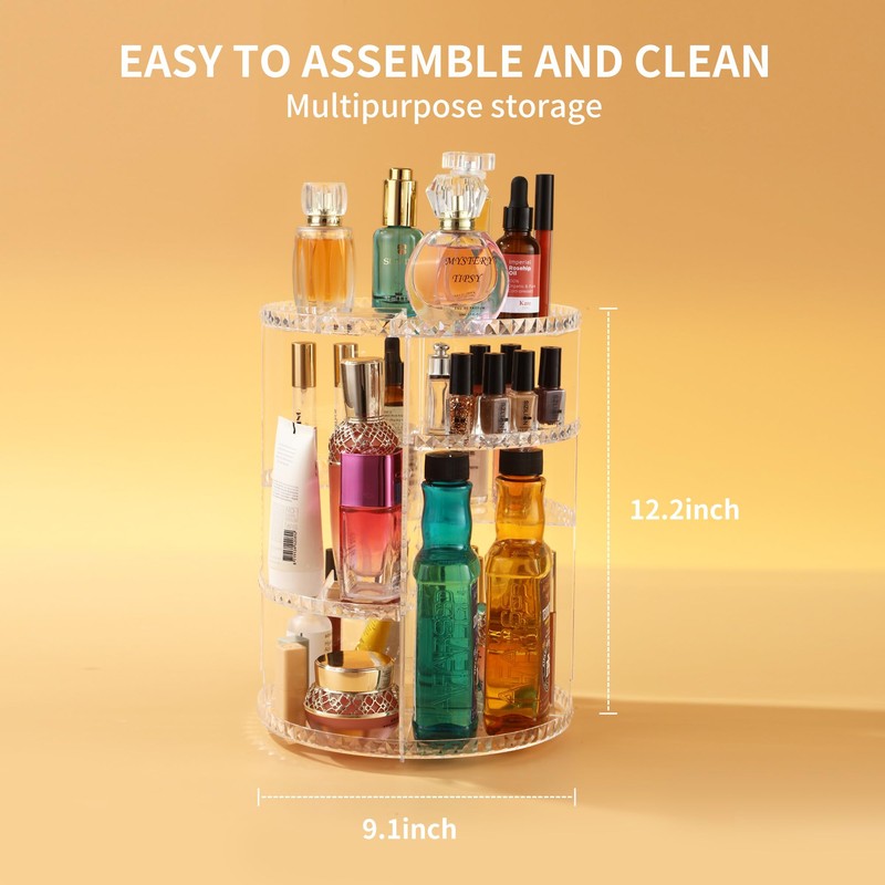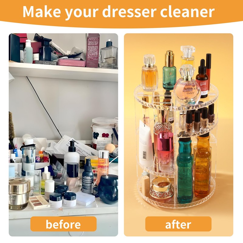 - Better storage: the rotating make-up organiser can store messy items better on the desktop, save 80% of desktop space and restore order on the desktop. Transparent color, you can quickly find what you need. The rotating make-up organiser can be adjusted to your preferences and requirements for the product height. On the top there are many small compartments in which you can store lipstick or other small items